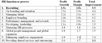 К счастью тех, кто сосредоточен на рекрутинге, Boston Consulting Group совместно с ассоциацией WFPMA выпустила корреляционное исследование, демонстрирующее силу отдельных функций управления персоналом. В исследовании (в котором приняли участие 4288 респондентов из 102 стран по широкому кругу отраслей) сравнивалась разница в росте прибыли и рентабельности на предприятиях с очень мощными HR- функциями для влияния на бизнес с влиянием на бизнес низковлиятельных